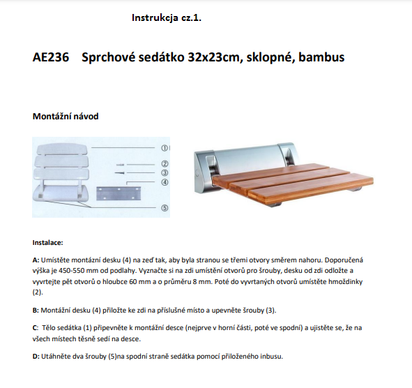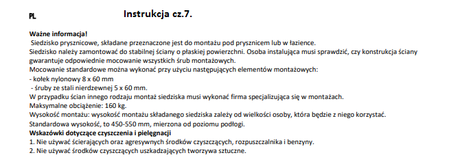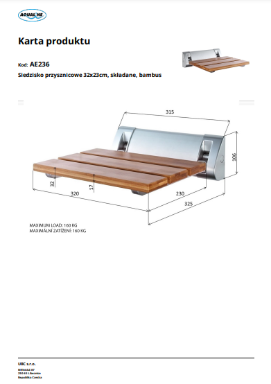 Siedzisko prysznicowe składane marki AQUALINE to elegancki i funkcjonalny gadżet, który ma za zadanie ułatwienie użytkowania łazienki. Ułatwienia i wygody potrzebuje każdy z nas, a w szczególności osoby, które mają na co dzień kłopoty z utrzymaniem równowagi. Kłopoty te mogą być spowodowane różnego rodzaju dolegliwościami, czasami zdrowotnymi, a czasami są spowodowane ograniczeniami związanymi z dojrzałym wiekiem. Konstrukcja siedziska jest dostosowana do ułatwienia korzystania z prysznica, dzięki temu produktowi ta czynność będzie o wiele prostsza, bezpieczniejsza, a konkretnie wygodniejsza dla wszystkich użytkowników łazienki, a w szczególności dla osób mających ograniczenia sprawności ruchowej, ponieważ biorąc prysznic można to zrobić wygodnie siedząc. Siedzisko wykonane jest z odpornego na wilgoć drewna bambusowego, które ma szerokie zastosowanie w akcesoriach łazienkowych, ponieważ nie chłonie wilgoci i doskonale ożywia aranż łazienki, nadając im cieplejszego charakteru :) Siedzisko opiera się na aluminiowej konstrukcji, która jest wytrzymała i stabilna, ponieważ montowana jest do ściany. Siedzisko jest na stałe przytwierdzone do ściany, dzięki czemu jest bezpieczne i wygodne, dodatkowo warto podkreślić, że jest składane, dzięki czemu mamy oszczędność miejsca w strefie prysznicowej :). Trochę wysiłku, ale po wykonanym montażu niesamowity komfort użytkowania, ponieważ nośność tego produktu opiewa na 160 kg, pomimo tego iż waga samego siedziska jest równa nieco ponad 2 kg ! Niesamowicie precyzyjna konstrukcja pozwala na utrzymanie tak dużego ciężaru jakim jest 160 kg :) Subtelny kolor ciepłego miodowego drewna w połączeniu z błyszczącym aluminium doskonale wkomponuje się w wystrój każdej łazienki. Prezentowane siedzisko zapewnia bezpieczny i wygodny pobyt w łazience, która staje się wygodnym i funkcjonalnym miejscem bez barier i ograniczeń :) Ten elegancki i ułatwiający funkcjonowanie produkt jest owocem pracy marki AQUALINE, która wywodzi się z rynku czeskiego i jak większość dobrze sprzedających się marek stawia w pierwszej kolejności na jakość, ale ta marka dba również o portfel klienta z tego względu, że liczy się z tym, że nie wszystko co dobre musi być bardzo drogie. Marka AQUALINE stawia na jakość, ale i na rozsądną cenę, która często jest wyznacznikiem zakupu w obecnych czasach. Jeżeli poszukujesz fajnego produktu w rozsądnej cenie, która nie doprowadzi cię do bankructwa warto zapoznać się z ofertą tego producenta :). Każdy śmiało może pokusić się o zakup tego genialnego i jednocześnie eleganckiego produktu, który będzie idealny dla osób, które z różnych względów mają trudności lub ograniczenia fizyczne :) warto podkreślić,, że siedzisko może wydawać się zbędnym gadżetem w łazience, ale jest to bardzo nietrafne skojarzenie gdyż prezentowany model świetnie wygląda i będzie fajną i wygodną odmianą w strefie prysznicowej :)