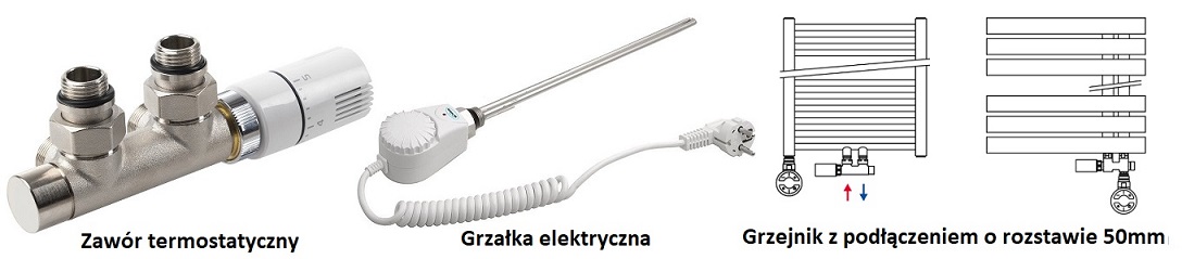 W przypadku gdy grzejnik jest ogrzewany wyłącznie elektrycznie, tzn. za pomocą grzałki, należy dodatkowo dokupić zaślepkę ½" , aby zatkać drugi otwór w grzejniku, który w przeciwnym razie zostałby wykorzystany do podłączenia do centralnego ogrzewania.