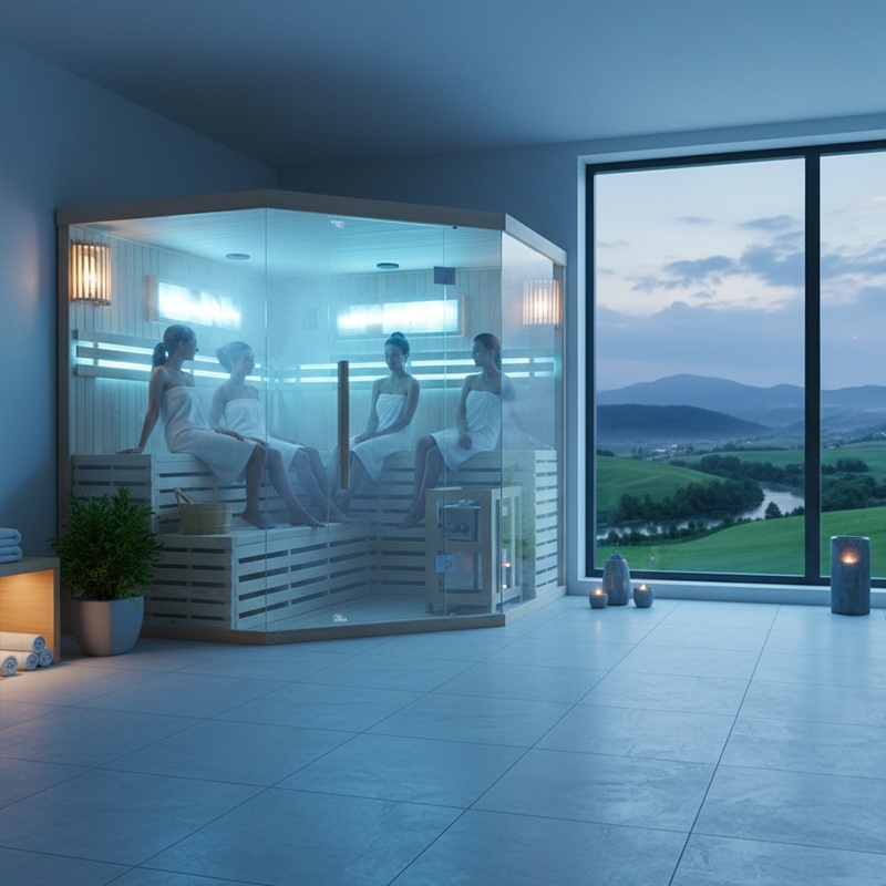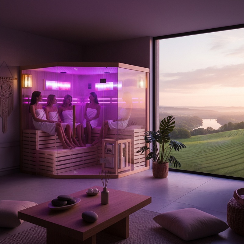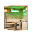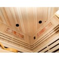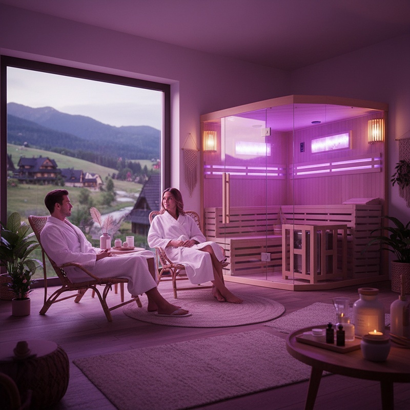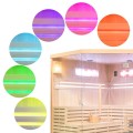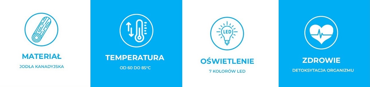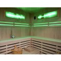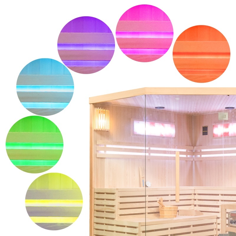 - koloroterapia / chromoterapia: oświetlenie 7 kolorami po całej szerokości sauny w oparciu na plecy, wspiera regenerację organizmu i uczestniczy w procesie wyciszenia.