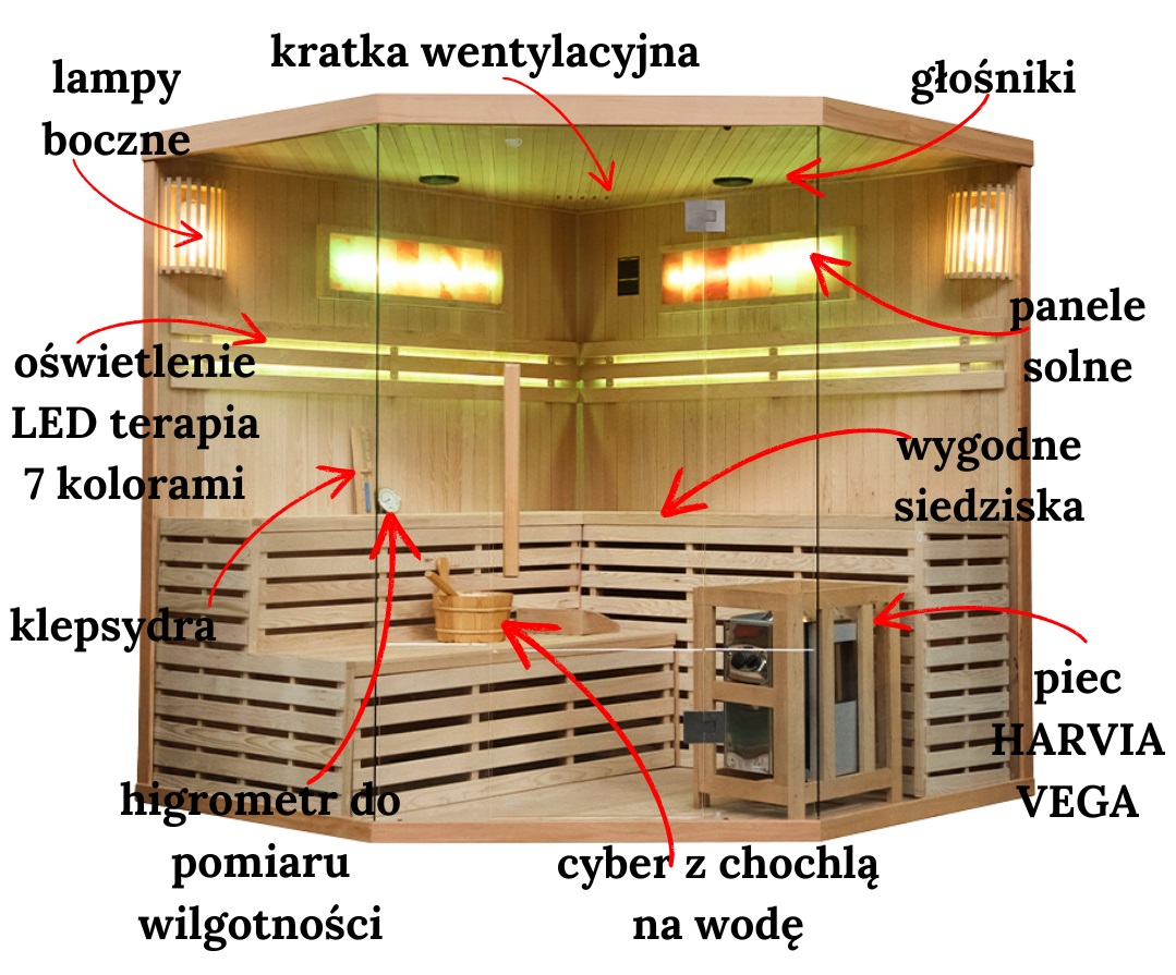 - oświetlenie wewnętrzne: 2 lampy montowane na ściankach, doświetlą nam wnętrze sauny,