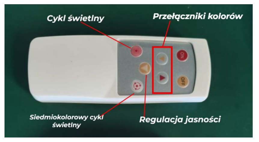 - pilot do regulacji jasności, ustawienia cyklu świetlnego kolorami umieszczonych w oparciu,