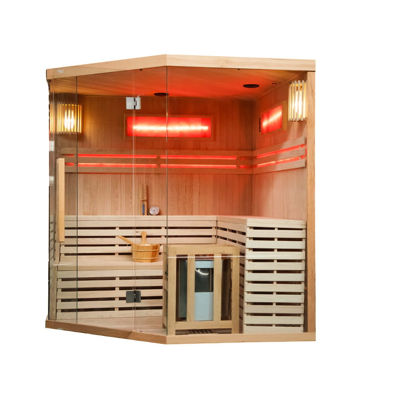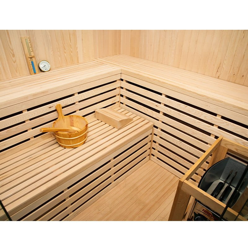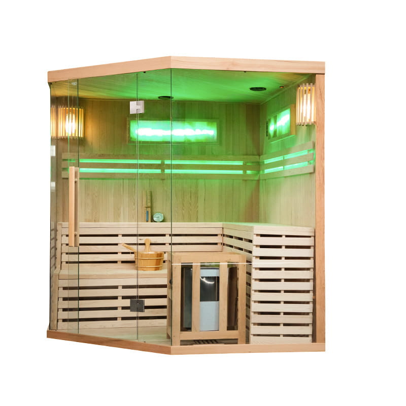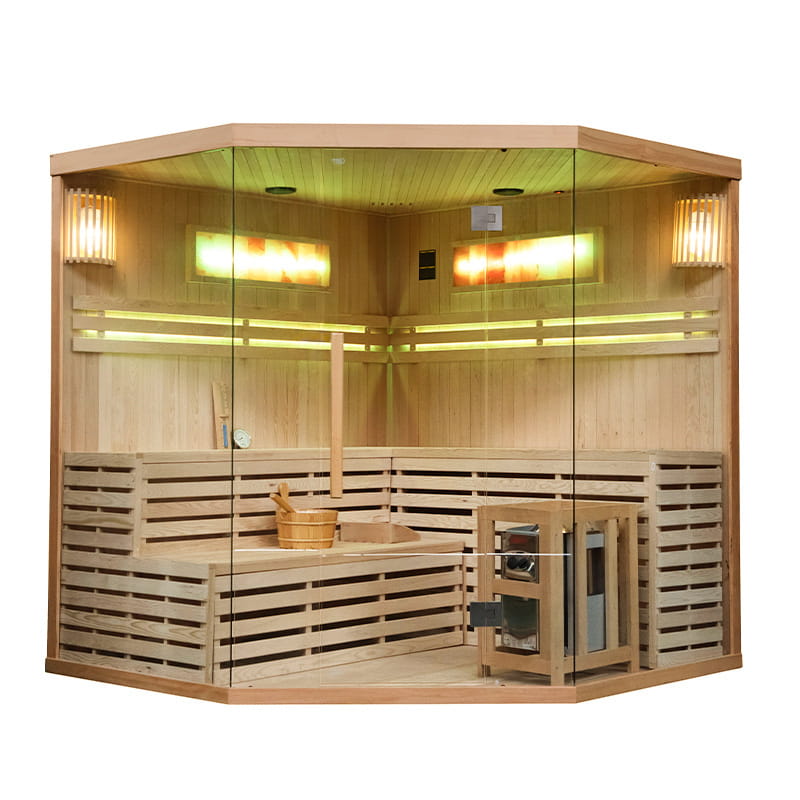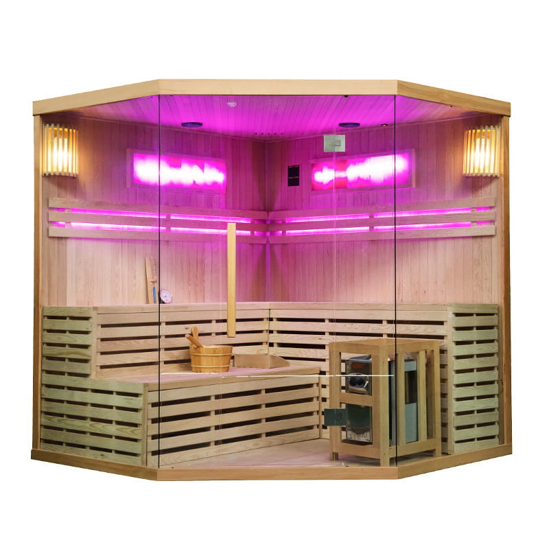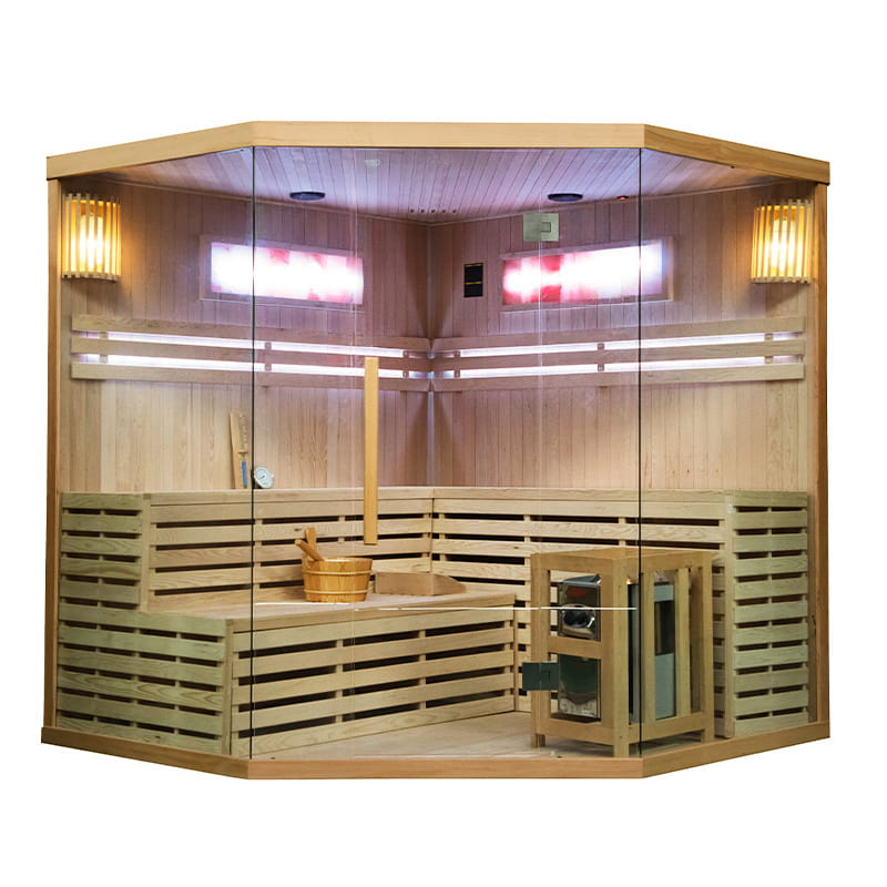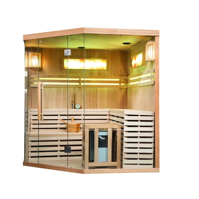 SAUNA FIŃSKA KEMI6 tradycyjna zwana również jako sauna sucha to propozycja stworzenia strefy komfortu dla siebie i bliskiej nam osoby we własnym domu. Wybierając saunę fińską firmy HYDROSAN stawiamy na zdrowie, relaks oraz komfort. Sauna KEMI6 wyposażona została w dwa duże panele solne, które wzbogacają powietrze w cenne mikroelementy. Wykonana jest z dobrej jakości drewna, jodły kanadyjskiej HEMLOCK, która wyróżnia się trwałością i odpornością na deformację oraz zapewnia właściwości izolacyjne. Wysoka temperatura powietrza jaka powstaje w saunie od 60 do 85 stopni Celsjusza przy wilgotności w granicach 5-15% osiągana jest dzięki specjalnemu piecowi HARVIA VEGA, który rozgrzewa generujące ciepło kamienie. Ta tradycyjna sauna rozgrzewa się od 30 do 60 minut i działa na nasz organizm wilgotnym, gorącym powietrzem. Wytworzone ciepło sprawia że nasz organizm się regeneruje, mobilizuje do poprawy mikrokrążenia, lepszego utlenowania oraz dużego pocenia. Korzystanie z tradycyjnej sauny przynosi wiele korzyści dla naszego samopoczucia i zdrowia, 1-2 razy w tygodniu to odpowiednia ilość uczestniczenia w terapeutycznych seansach. Sauna pomaga wzmocnić odporność, złagodzić przewlekłe bóle mięśniowe oraz poprawia wydolność krążenia, sprzyja przystosowaniu naszego organizm do zmian temperatury. Jest idealnym sposobem na oczyszczenie organizmu z toksyn, co bezpośrednio wpływa nie tylko na zdrowie, ale również urodę Oprócz korzyści dla ciała, sauna fińska tradycyjna ma również pozytywny wpływ na nasz umysł. Relaksujący i kojący klimat pozwala nam oderwać się od codziennego stresu i napięcia, terapeutyczna moc oraz relaksacyjny charakter sprawiają, że jest to jedno z najpopularniejszych i najbardziej cenionych miejsc w kulturze fińskiej i na świecie.