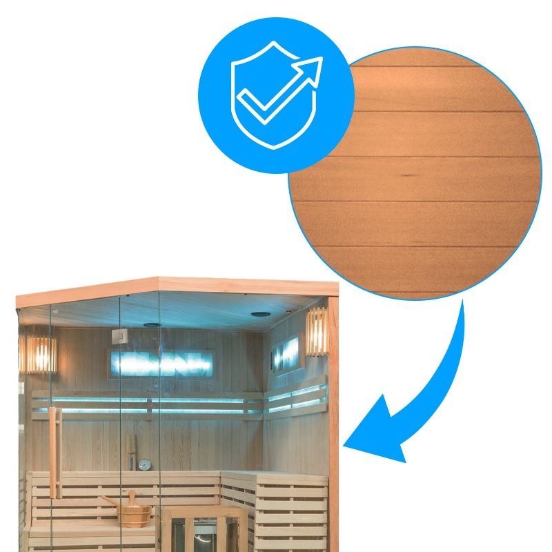 Wnętrze sauny zalecamy zabezpieczyć olejem parafinowym przeznaczonym do saun, co ułatwia utrzymanie czystości i może dodatkowo przedłużyć trwałość drewna.