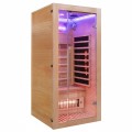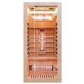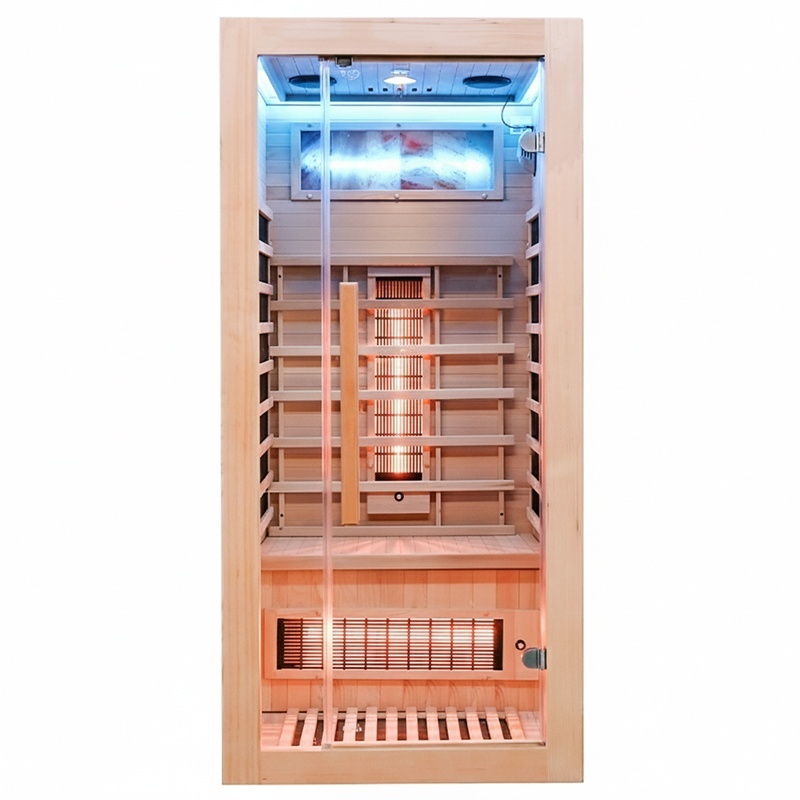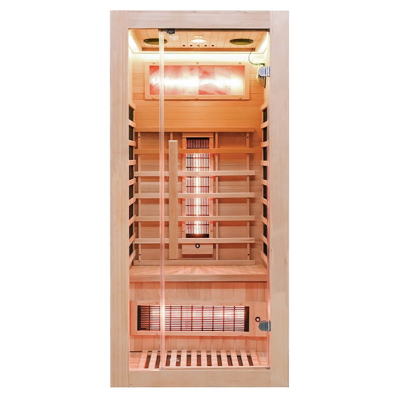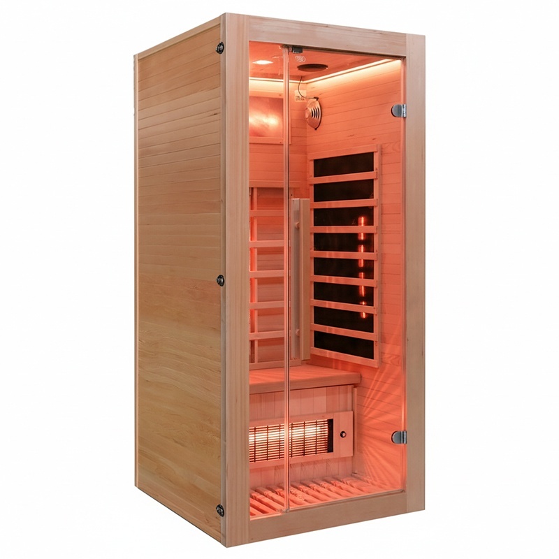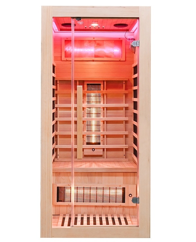 SAUNA INFRARED ALTA1 zwana również jako sauna sucha to propozycja stworzenia strefy komfortu dla siebie i bliskiej nam osoby we własnym domu. Wybierając saunę infrared firmy HYDROSAN stawiamy na zdrowie, relaks oraz komfort. Sauna ALTA1 wyposażona została w panel solny, który wzbogaca powietrze w cenne mikroelementy . Wykonana została z dobrej jakości drewna, jodły kanadyjskiej HEMLOCK, która wyróżnia się trwałością i odpornością na deformację oraz zapewnia właściwości izolacyjne. Temperatura powietrza jaka powstaje osiągana jest dzięki wysokiej klasy energooszczędnym grzejnikom karbonowym i kwarcowym, które zapewniają równomierny rozkład ciepła w całej saunie. Działanie sauny infrared polega na emitowaniu promieniowania podczerwonego, które działa na różnych głębokościach tkanek, przenika głęboko w skórę i podgrzewa ciało od wewnątrz. Jest to bardziej efektywne i łagodniejsze dla skóry, co pozwala na dłuższe i bardziej komfortowe sesje w saunie. Promieniowanie to odpowiada za nasze dobre samopoczucie, zapobiega zaburzeniom rozwoju układu kostnego, daje poczucie wewnętrznego ciepła i stymuluje biologiczne przemiany w organizmie niezbędne do utrzymania homeostazy i ogólnego zdrowia. Dzięki zastosowaniu tego promieniowania, terapia w saunach infrared jest bardzo skuteczna w walce z celulitem i ujędrnianiem ciała poprzez lipolizę i rozpad trójglicerydów i lipidów komórek tkanki tłuszczowej. Ważne jest również, że z saunowania korzystać mogą osoby młodsze i starsze, z chorobami będącymi przeciwwskazaniem do korzystania z tradycyjnych saun. Warto dodać, że z saun infrared jest możliwość korzystania w ubraniu co dla niektórych osób jest dużym udogodnieniem. Natomiast dla osób które nie lubią zamkniętych pomieszczeń ważnym jest że nie trzeba zamykać drzwi co nie ma wpływu na jakość korzystania z sauny. Oprócz korzyści dla ciała, sauna ALTA1 ma również pozytywny wpływ na nasz umysł. Relaksujący i kojący klimat pozwala nam oderwać się od codziennego stresu i napięcia, terapeutyczna moc oraz relaksacyjny charakter sprawiają, że jest to jedno z najpopularniejszych i najbardziej cenionych miejsc w Polsce i na świecie.