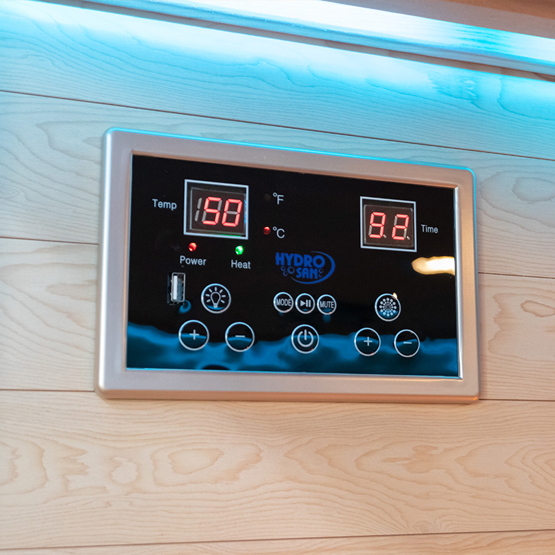 - cyfrowy panel sterowania wewnątrz sauny z funkcją BLUETOOTH, wyjściem USB, panel umożliwia łatwe zarządzanie, a podczas seansu cieszyć się ulubiona muzyką lub podcastem,