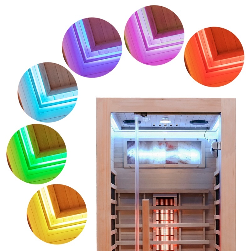 - koloroterapia / chromoterapia: oświetlenie LED 7 kolorami umieszczone w suficie, wspiera regenerację organizmu i uczestniczy w procesie wyciszenia,