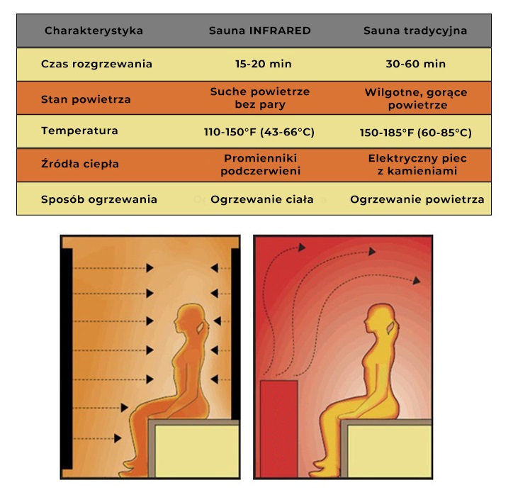 Sauna infrared łagodzi złe samopoczucie, wywołane bólami pleców i stawów, przemęczeniem, reumatyzmem, nerwobólami, chorobą zwyrodnieniową, jak również bólami pourazowymi, głównie po oparzeniach. Regularne korzystanie z zabiegów poprawia ogólny stan zdrowia. Emitowane promieniowanie podczerwone odpowiada za nasze dobre samopoczucie, zapobiega zaburzeniom rozwoju układu kostnego, daje poczucie wewnętrznego ciepła i stymuluje biologiczne przemiany w naszym organizmie.