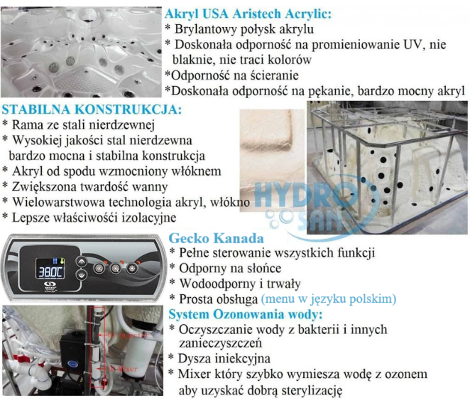 • Niepowtarzalny Design, jakość oraz precyzja w wykonaniu każdego detalu jacuzzi, najlepsze materiały oraz komponenty z USA: Akryl Aristech Acrylic (antybakteryjny), sterowanie Balboa lub Kanadyjskiej firmy Gecko liderzy w śród sterowników na całym świecie.