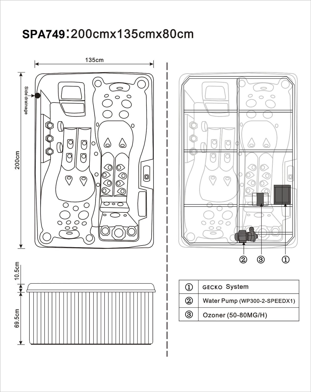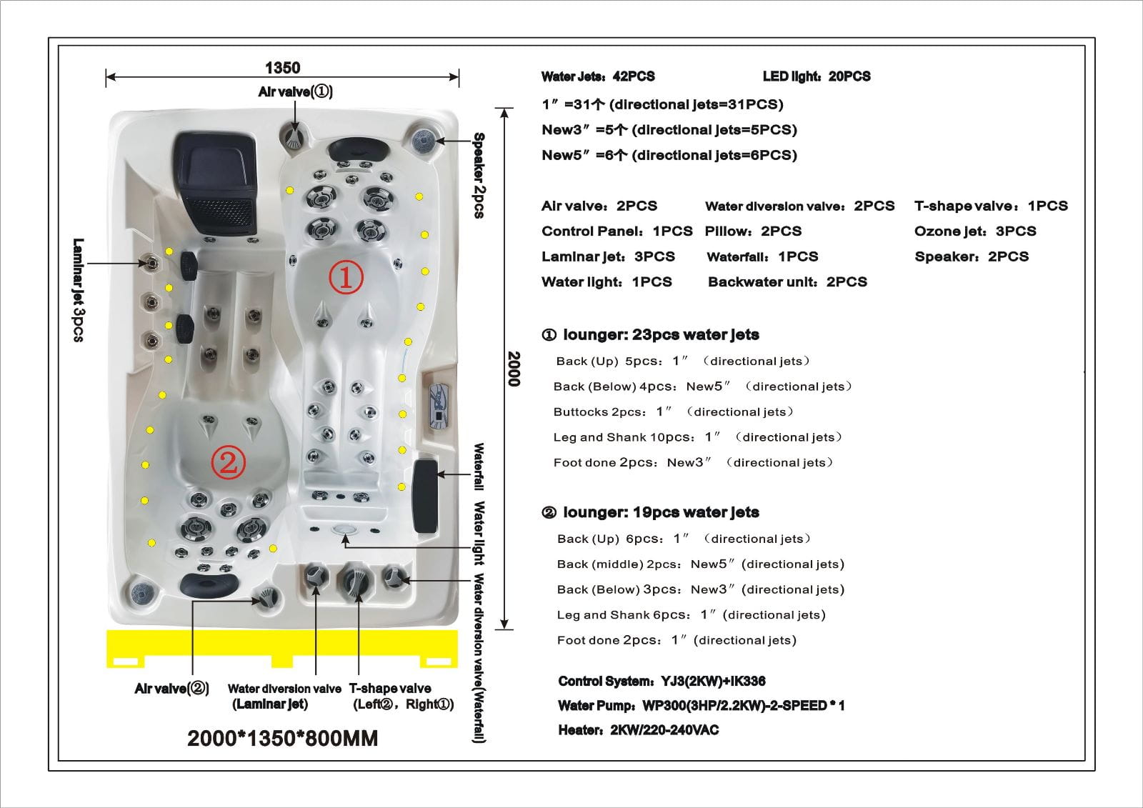 • bardzo mocne pompy wody do hydromasażu oraz cyrkulacji  (Pompa dwubiegowa): Moc 3.0HP (2,2KW) - 1 szt,