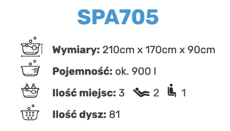 Wanna HYDROSAN SPA705 to 3-osobowe jacuzzi SPA z hydromasażem o nowoczesnym stylu i przemyślanej budowie. Posiadanie własnej wanny ogrodowej umożliwia relaksujące kąpiele bez względu na porę dnia czy roku. Możliwość odprężenia się w wannie SPA po ciężkim dniu w szkole, na uczelni czy w pracy to coś, o czym marzy wiele osób. Prywatne SPA daje również wspaniałą okazję na niesamowitą rozrywkę dla całej rodziny. Jacuzzi 3-osobowe (2 miejsca leżące i 1 siedzące) może również uświetnić wszelkie spotkania o charakterze towarzyskim. Z kolei w przypadku przyjęć organizowanych dla dzieci minibasen świetnie sprawdzi się jako dodatkowa atrakcja dla najmłodszych uczestników zabawy. Jacuzzi wanna SPA 3-osobowa 210×170 może znajdować się zarówno we wnętrzu budynku, jak i pełnić funkcję jacuzzi tarasowego bądź basenu ogrodowego. Wyposażona jest w najwyższej jakości panel sterowania renomowanego producenta Gecko, co pozwala na sprawne i intuicyjne sterowanie nią. Dodatkowym atutem jest menu w języku polskim.