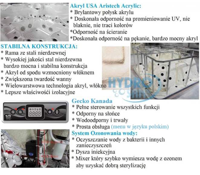 - Niepowtarzalny Design, jakość oraz precyzja w wykonaniu każdego detalu jacuzzi, najlepsze materiały oraz komponenty z USA: Akryl Aristech Acrylic (antybakteryjny), sterowanie Balboa lub Kanadyjskiej firmy Gecko liderzy w śród sterowników na całym świecie.