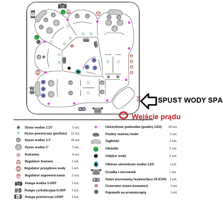 - zawory LED napowietrzanie pompy wody oraz powietrza: 2 szt (Słabszy/mocniejszy masaż - masaż perełkowy),