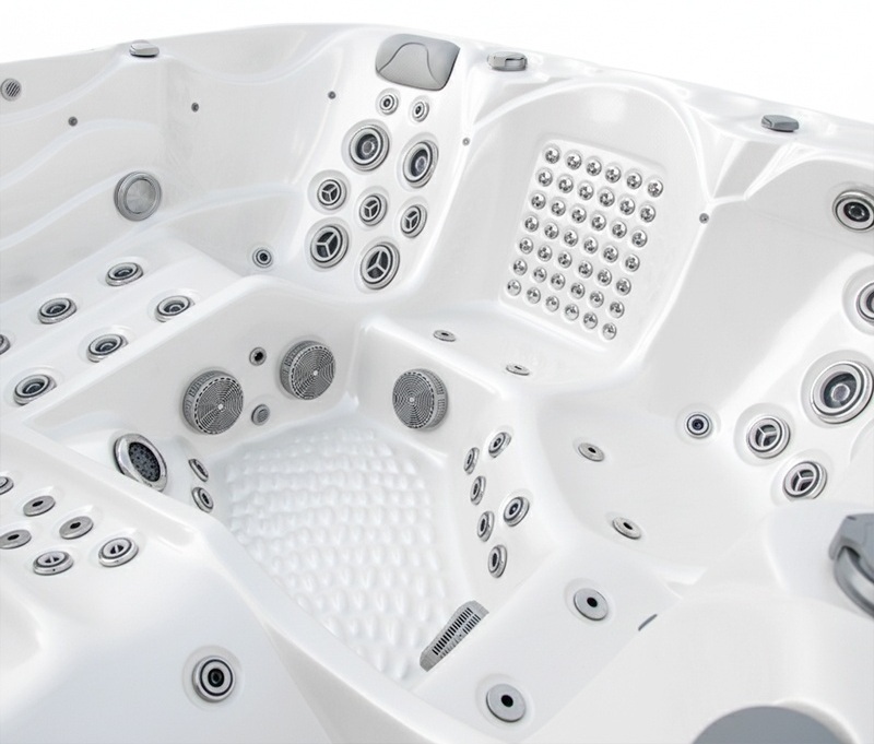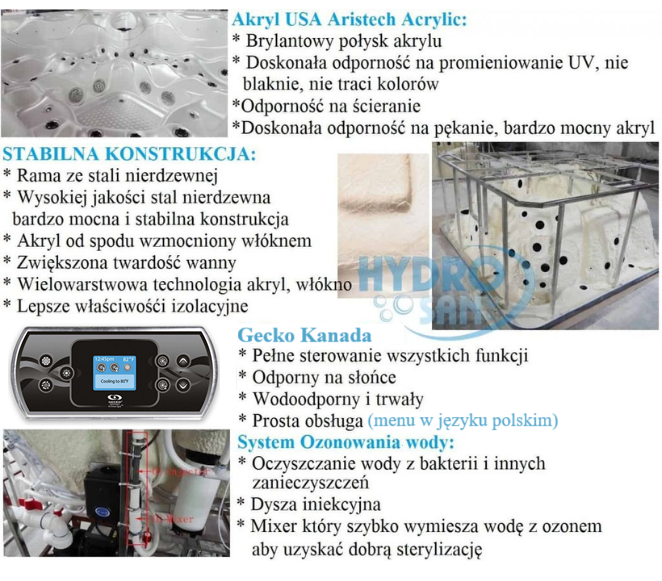 - Niepowtarzalny Design, jakość oraz precyzja w wykonaniu każdego detalu jacuzzi, najlepsze materiały oraz komponenty z USA: Akryl Aristech Acrylic (antybakteryjny), sterowanie Balboa lub Kanadyjskiej firmy Gecko liderzy w śród sterowników na całym świecie.