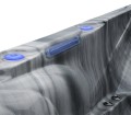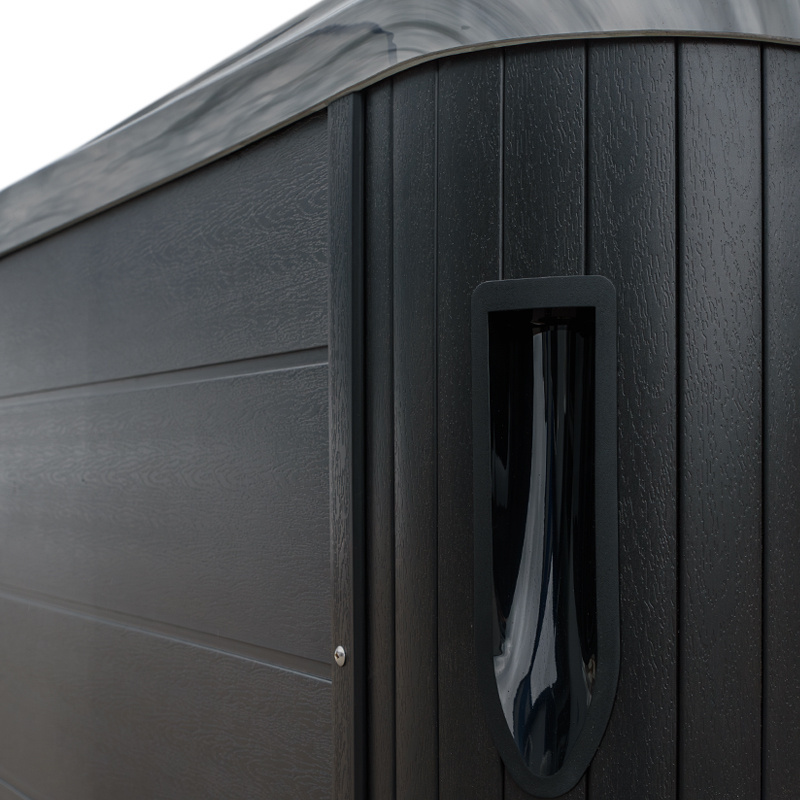 Wnętrze wanny wykonane jest z wysokojakościowego akrylu sanitarnego produkcji amerykańskiej firmy ARISTECH w wyjątkowym kolorze ODYSSEY, który łączy w sobie stonowaną elegancję z efektownym marmurkowym wzorem. Subtelne, perłowo-szare żyłkowanie przywodzi na myśl głębię oceanicznej wody i szlachetność kamieni naturalnych, tworząc niezwykle stylowy efekt wizualny. W zestawieniu z nowoczesną, antracytową obudową powstaje kompozycja, która idealnie wpasuje się zarówno w nowoczesne, jak i klasyczne aranżacje ogrodu czy tarasu. To kolor, który uspokaja, relaksuje i wprowadza w stan głębokiego odprężenia. W komfortowym ułożeniu ciała pomagają trzy miękkie i ergonomiczne zagłówki. Możliwość regulowania temperatury wody zgodnie z własnymi preferencjami sprawia, że każda kąpiel staje się spersonalizowanym rytuałem relaksu. Wanna została wyposażona w solidne schodki, ułatwiające bezpieczne korzystanie, oraz w pokrywę termiczną, która chroni wodę przed wychłodzeniem. To oznacza, że jacuzzi można użytkować przez cały rok, niezależnie od pogody – w domowym zaciszu, na tarasie czy w ogrodzie.
