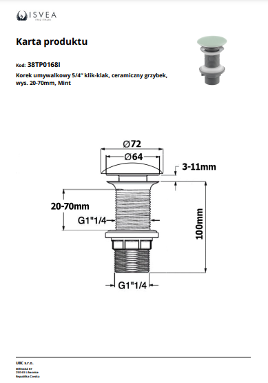 Korek Klik-Klak jest to nowoczesna odmiana mechanizmu zamykającego odpływy umywalkowe. Nie trzeba już zastanawiać się, gdzie umieścić gumowy korek, łańcuszek nie będzie przeszkadzał, system Klik Klak jest obsługiwany przez proste naciśnięcie korka. Zero wysiłku, maksimum wygody i funkcjonalności :) Prezentowany korek został wykonany z wytrzymałego i bezpiecznego plastiku, a tak zwany grzybek jest w kolorze MINT - czyli kolorze pastelowej - jasnej zieleni, który inspiruje i zachęca do zakupu ze względu na swoją oryginalność :) Ten prześliczny maluszek jest częścią szerokiej gamy produktów marki marki ISVEA, czyli producenta sanitariatów łazienkowych o bardzo dobrej jakości w dostępnej cenie. ISVEA zakłada, że łazienka, to harmonijna przestrzeń przeznaczona do relaksu i regeneracji sił. Pierwotnie włoska marka z długoletnią tradycją założona w roku 1962, została zakupiona w roku 2013 przez turecką firmę ECE HOLDING. Zakład produkcyjny znajduje się w Turcji, ale design i jakość wykonania nadal spełniają włoskie standardy. Obecnie firma zatrudnia około 520 pracowników :) Warto podkreślić, że ten niesamowicie ekstrawagancki kolor MINT dodaje wyjątkowości tak zwykłemu przedmiotowi jak korek odpływowy :)