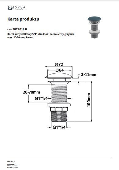 Korek Klik-Klak jest to nowoczesna odmiana mechanizmu zamykającego odpływy umywalkowe. Nie trzeba już zastanawiać się, gdzie umieścić gumowy korek, łańcuszek nie będzie przeszkadzał, system Klik Klak jest obsługiwany przez proste naciśnięcie korka. Zero wysiłku, maksimum wygody i funkcjonalności :) Prezentowany korek został wykonany z wytrzymałego i bezpiecznego plastiku, a tak zwany grzybek jest w kolorze PETROL - czyli mix głębokiego niebieskiego z domieszką zieleni (w uproszczeniu - morski), który inspiruje i zachęca do zakupu ze względu na swoją nietuzinkową oryginalność :) Ten prześliczny maluszek jest częścią szerokiej gamy produktów marki marki ISVEA, czyli producenta sanitariatów łazienkowych o bardzo dobrej jakości w dostępnej cenie. ISVEA zakłada, że łazienka, to harmonijna przestrzeń przeznaczona do relaksu i regeneracji sił. Pierwotnie włoska marka z długoletnią tradycją założona w roku 1962, została zakupiona w roku 2013 przez turecką firmę ECE HOLDING. Zakład produkcyjny znajduje się w Turcji, ale design i jakość wykonania nadal spełniają włoskie standardy. Obecnie firma zatrudnia około 520 pracowników :) Warto podkreślić, że ten niesamowicie ekstrawagancki kolor PETROL dodaje wyjątkowości tak zwykłemu przedmiotowi jak korek odpływowy :)