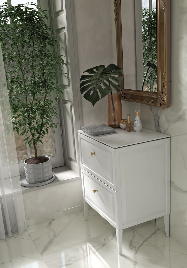 MONTEBIANCO to tradycja i estetyka w stylowej łazience. W tej kolekcji dajemy możliwość dodatkowego komponowania szafek z nóżkami, które nie tylko uzupełniają tę kolekcję stylistycznie, ale też wspierają zawieszone korpusy na ścianie. Kolekcja Montebianco doskonale sprawdzi się zarazem w niewielkich łazienkach i zaaranżowaniu dużych toalet. W skład kolekcji wchodzą: szafki podumywalkowe w wymiarach 50 cm, 60 cm, 80 cm i 120 cm, słupki o szerokości 35 i 40 cm oraz lustra w ramie 40 cm i 60 cm. Szafki występują w kolorze biały mat oraz piaskowy mat. Opcjonalnie można zmienić uchwyt na lakierowany czarny mat, złoty połysk lub błyszczący glamour z kryształem. Korpusy i frony mebli są z płyty MDF lakierowanej, wilgocioodpornej, boki szuflad są metalowe, w szufladach górnych wymiennie wkłady i elementy stałej organizacji. W słupkach jest 6 regulowanych szklanych półek.