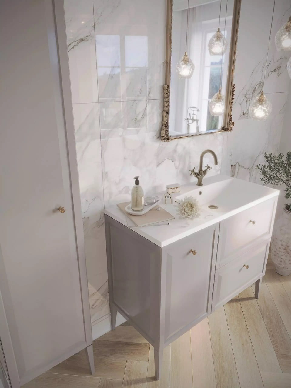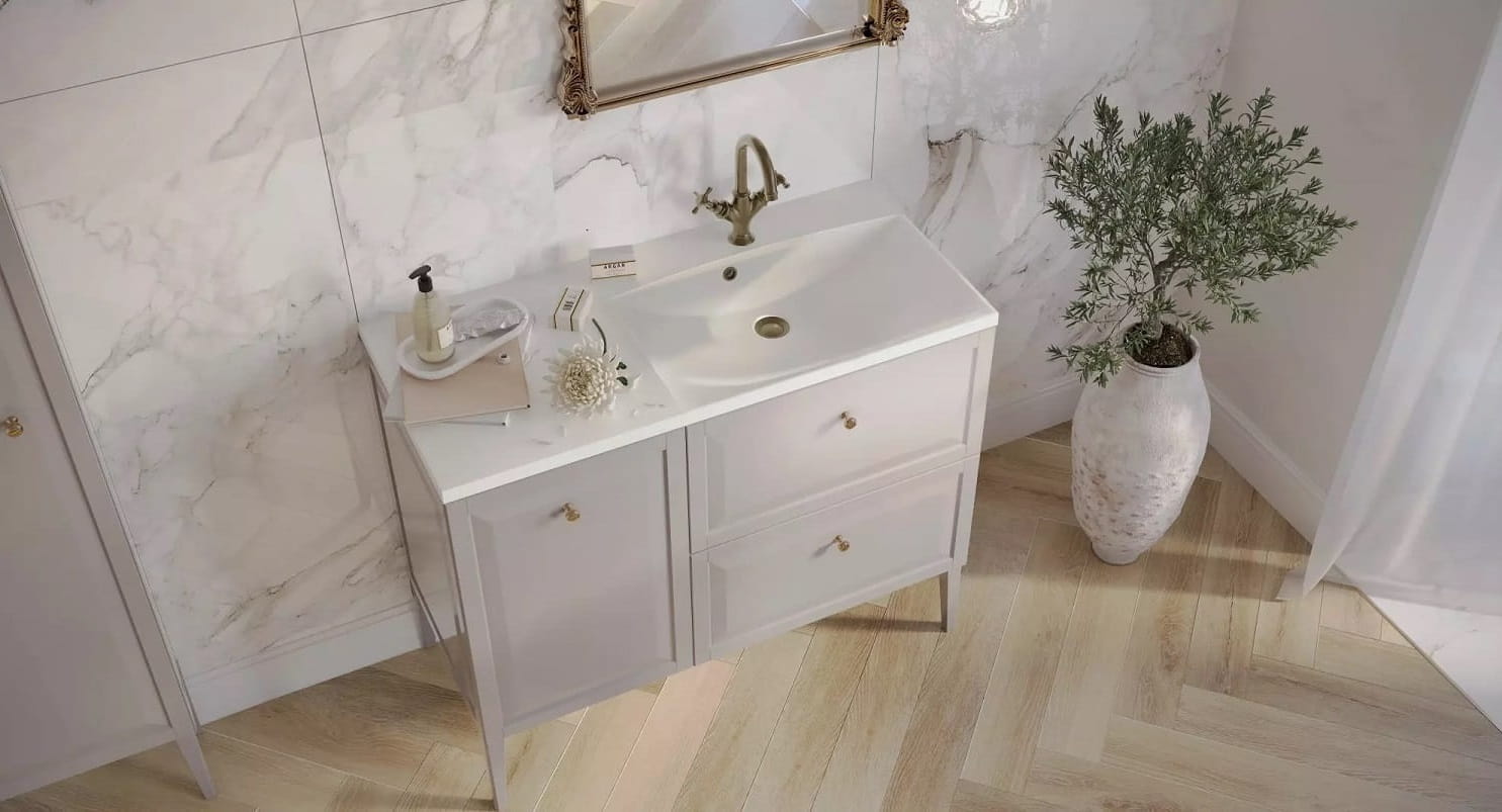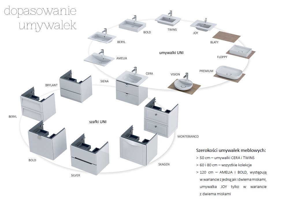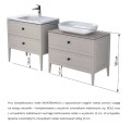 MONTEBIANCO to tradycja i estetyka w stylowej łazience. W tej kolekcji dajemy możliwość dodatkowego komponowania szafek z nóżkami, które nie tylko uzupełniają tę kolekcję stylistycznie, ale też wspierają zawieszone korpusy na ścianie. Kolekcja Montebianco doskonale sprawdzi się zarazem w niewielkich łazienkach i zaaranżowaniu dużych toalet. W skład kolekcji wchodzą: szafki podumywalkowe w wymiarach 50 cm, 60 cm, 80 cm i 120 cm, słupki o szerokości 35 i 40 cm oraz lustra w ramie 40 cm i 60 cm. Szafki występują w kolorze biały mat oraz piaskowy mat. Opcjonalnie można zmienić uchwyt na lakierowany czarny mat, złoty połysk lub błyszczący glamour z kryształem. Korpusy i frony mebli są z płyty MDF lakierowanej, wilgocioodpornej, boki szuflad są metalowe, w szufladach górnych wymiennie wkłady i elementy stałej organizacji. W słupkach jest 6 regulowanych szklanych półek.