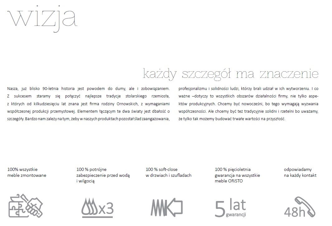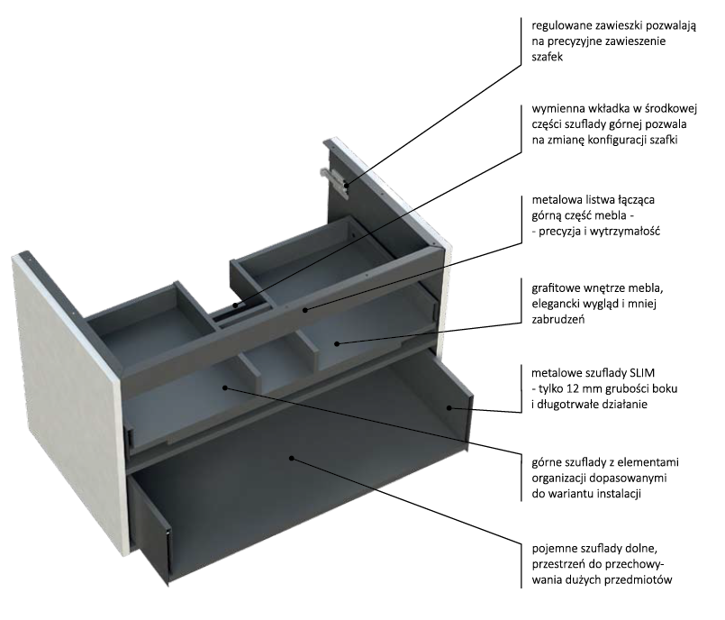 Projektując nasze kolekcje uniwersalne włożyliśmy wiele wysiłku, aby wnętrza szafek wyróżniały się wysokim standardem i elegancją. Ciemne korpusy szuflad, idealnie harmonizujące z najwyższej klasy metalowymi bokami oraz zabezpieczone grafitowym lakierem wewnętrzne powierzchnie korpusów – wszystko to jest synonimem najwyższej jakości. Ale ma to też walor funkcjonalny – w takim wnętrzu nie widać śladów zużycia i zniszczenia powierzchni a lakierowanie wnętrza korpusów dodatkowo zabezpiecza te elementy przed działaniem wody.