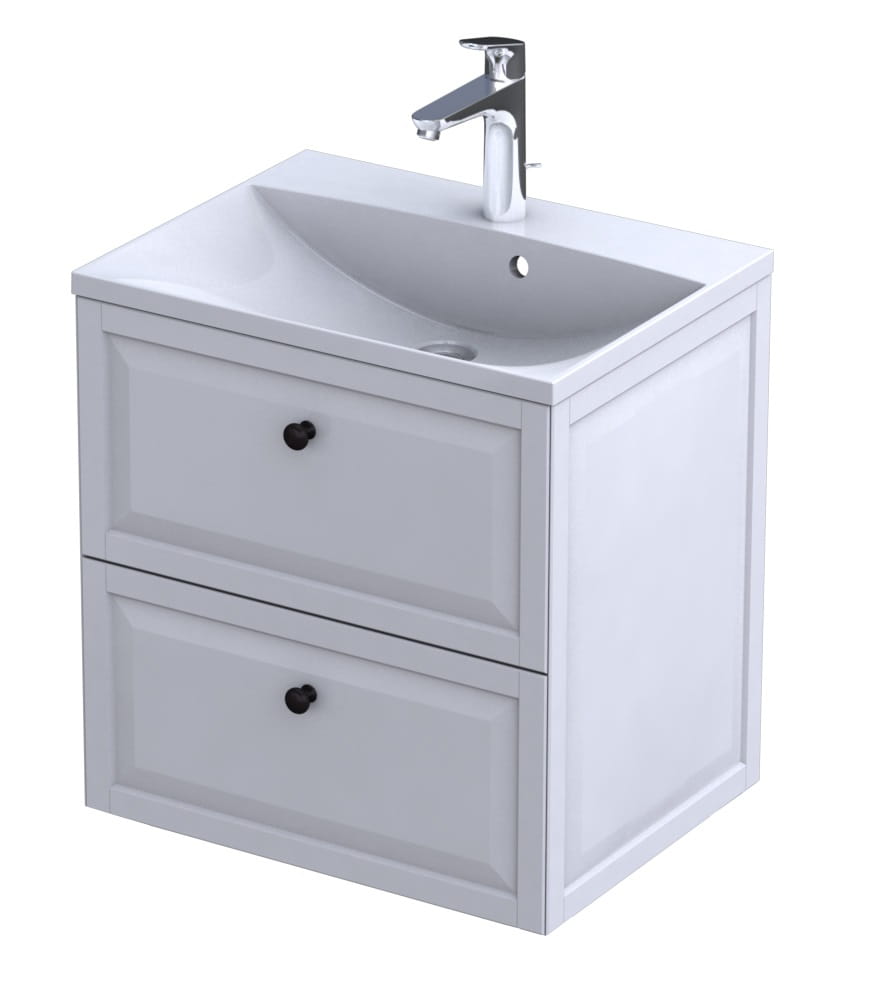 Zestaw łazienkowy zawiera: Szafkę podumywalkową Montebianco 60 cm OR47-SD2S-60-2, Szafkę wiszącą boczną niską Montebianco 40 cm z koszem OR47-SN1S-40-2 oraz umywalkę meblową UME-AM-100-92-P.