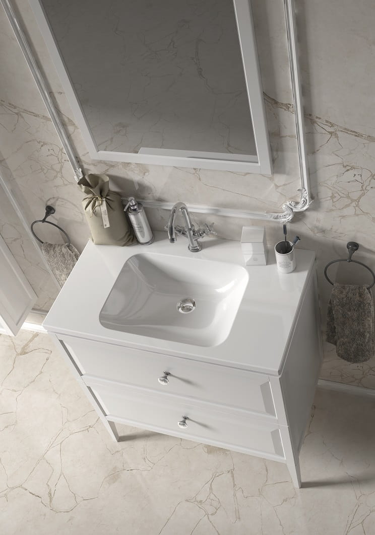 MONTEBIANCO to tradycja i estetyka w stylowej łazience. W tej kolekcji dajemy możliwość dodatkowego komponowania szafek z nóżkami, które nie tylko uzupełniają tę kolekcję stylistycznie, ale też wspierają zawieszone korpusy na ścianie. Kolekcja Montebianco doskonale sprawdzi się zarazem w niewielkich łazienkach i zaaranżowaniu dużych toalet. W skład kolekcji wchodzą: szafki podumywalkowe w wymiarach 50 cm, 60 cm, 80 cm i 120 cm, słupki o szerokości  35 i 40 cm oraz lustra w ramie 40 cm i 60 cm. Szafki występują w kolorze biały mat oraz piaskowy mat. Opcjonalnie można zmienić uchwyt na lakierowany czarny mat, złoty połysk lub błyszczący glamour z kryształem. Korpusy i frony mebli są z płyty MDF lakierowanej, wilgocioodpornej, boki szuflad są metalowe, w szufladach górnych wymiennie wkłady i elementy stałej organizacji. W słupkach jest 6 regulowanych szklanych półek.