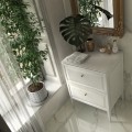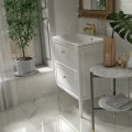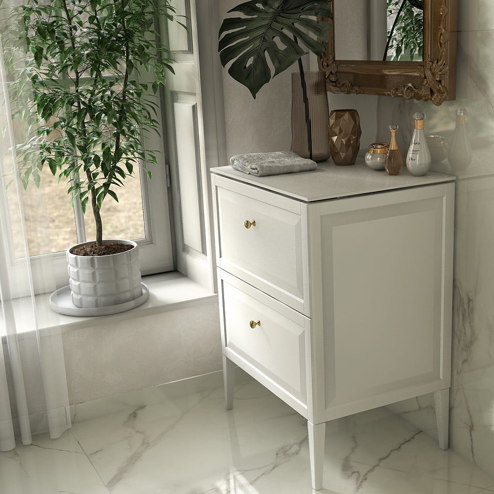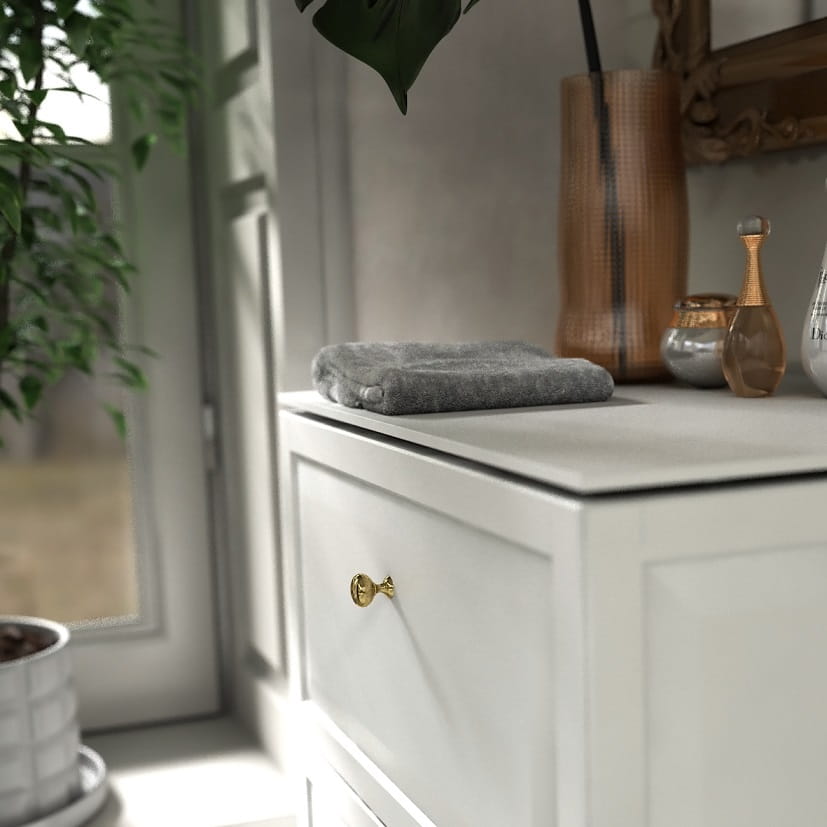 MONTEBIANCO to tradycja i estetyka w stylowej łazience. W tej kolekcji dajemy możliwość dodatkowego komponowania szafek z nóżkami, które nie tylko uzupełniają tę kolekcję stylistycznie, ale też wspierają zawieszone korpusy na ścianie. Kolekcja Montebianco doskonale sprawdzi się zarazem w niewielkich łazienkach i zaaranżowaniu dużych toalet. W skład kolekcji wchodzą: szafki podumywalkowe w wymiarach 50 cm, 60 cm, 80 cm i 120 cm, słupki o szerokości 35 i 40 cm oraz lustra w ramie 40 cm i 60 cm. Szafki występują w kolorze biały mat oraz piaskowy mat. Opcjonalnie można zmienić uchwyt na lakierowany czarny mat, złoty połysk lub błyszczący glamour z kryształem. Korpusy i frony mebli są z płyty MDF lakierowanej, wilgocioodpornej, boki szuflad są metalowe, w szufladach górnych wymiennie wkłady i elementy stałej organizacji. W słupkach jest 6 regulowanych szklanych półek.