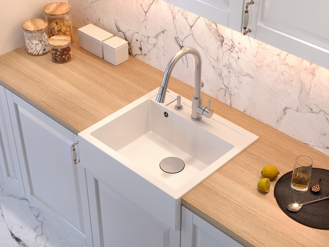 Zestaw zawiera zlewozmywak MORGAN 110 GraniteQ SILVER STONE + bateria kuchenna GEMMA Q LINE SLIM z ruchomą wylewką + syfon Push-2-Open save space z odpływem 3,5" SteelQ PVD stalowy