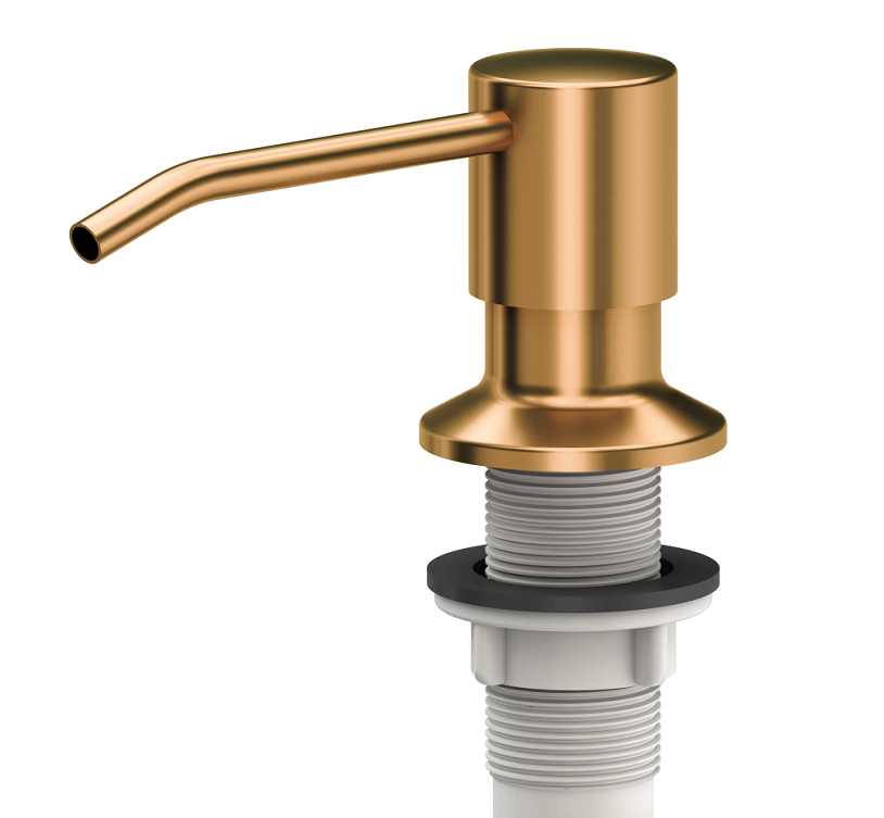 Dozownik na płyn lub mydło ze stali szlachetnej PVD w kolorze miedzianym. Idealnie pasuje do zlewozmywaka granitowego, stalowego, ceramicznego, szklanego.