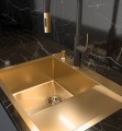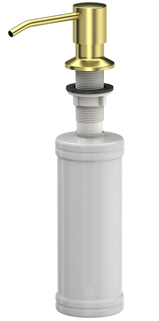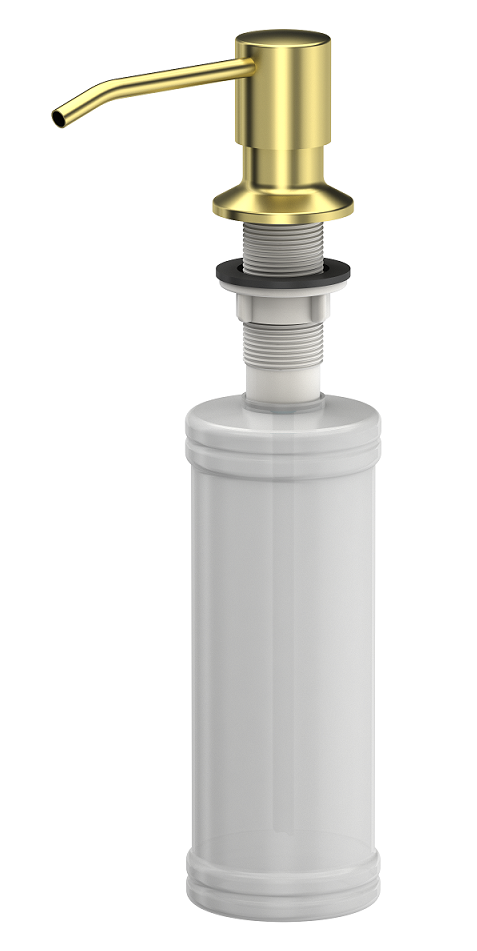 Dozownik na płyn lub mydło ze stali szlachetnej PVD w kolorze złotym. Idealnie pasuje do zlewozmywaka granitowego, stalowego, ceramicznego, szklanego.