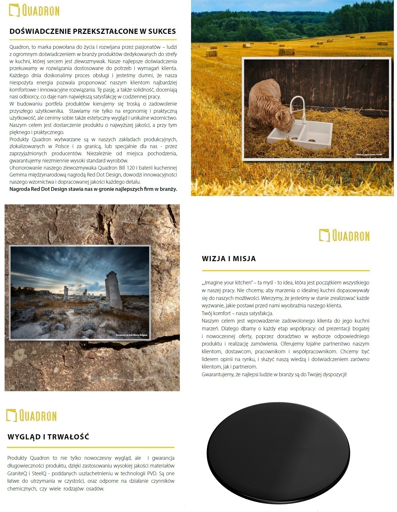 Zestaw zawiera zlewozmywak MORGAN 111 GraniteQ PURE CARBON + bateria kuchenna RACHEL Q LINE + syfon Push-2-Open save space z odpływem 3,5" SteelQ PVD złoty