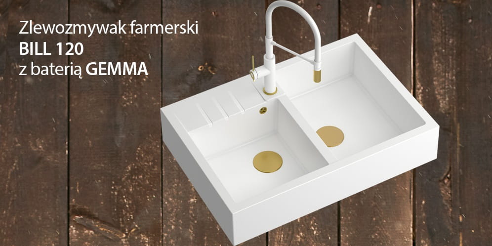 Zestaw zawiera zlewozmywak MORGAN 111 GraniteQ PURE CARBON + bateria kuchenna INGRID Q LINE+ syfon Push-2-Open save space z odpływem 3,5" SteelQ PVD złoty