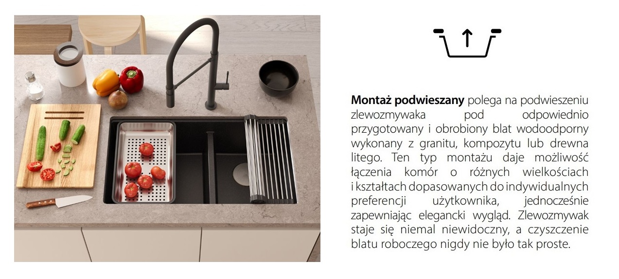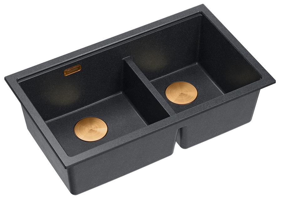 Zestaw zawiera zlewozmywak podwieszany LOGAN 120 GraniteQ BLACK DIAMOND + nakładka na odpływ + syfon save space z odpływem 3,5" SteelQ PVD miedziany