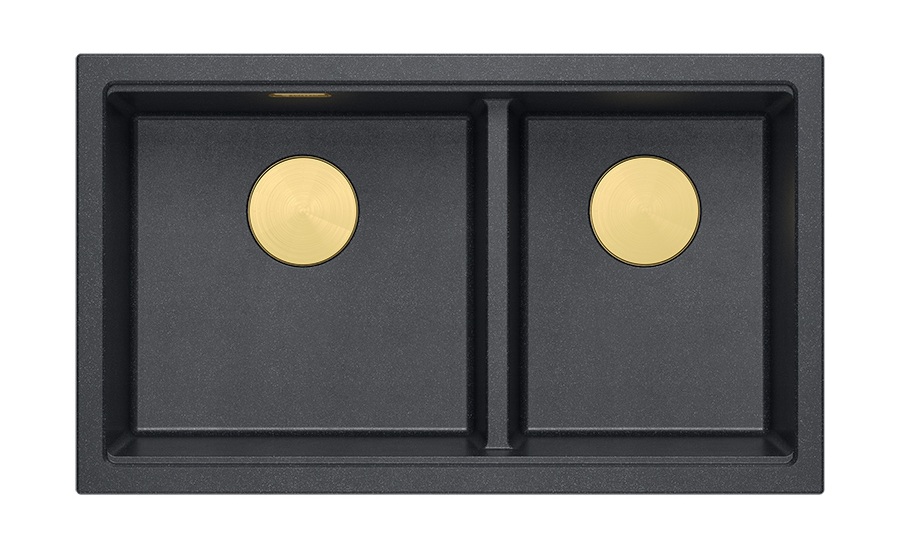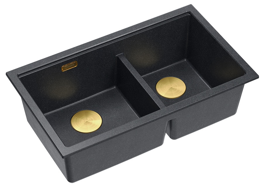 Zestaw zawiera zlewozmywak podwieszany LOGAN 120 GraniteQ BLACK DIAMOND + nakładka na odpływ + syfon save space z odpływem 3,5" SteelQ PVD złoty