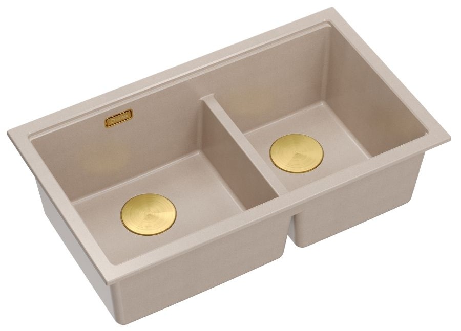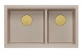 Zestaw zawiera zlewozmywak podwieszany LOGAN 120 GraniteQ PEARL BEIGE (perłowy beż) + nakładka na odpływ + syfon save space z odpływem 3,5" SteelQ PVD złoty