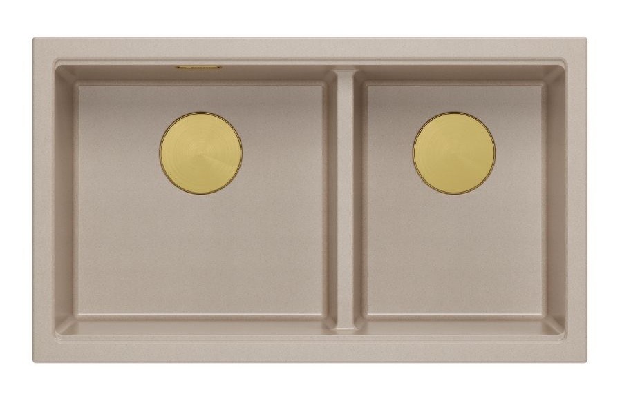 Zestaw zawiera zlewozmywak wpuszczany LOGAN 120 GraniteQ PEARL BEIGE (perłowy beż) + nakładka na odpływ + syfon save space z odpływem 3,5" SteelQ PVD złoty