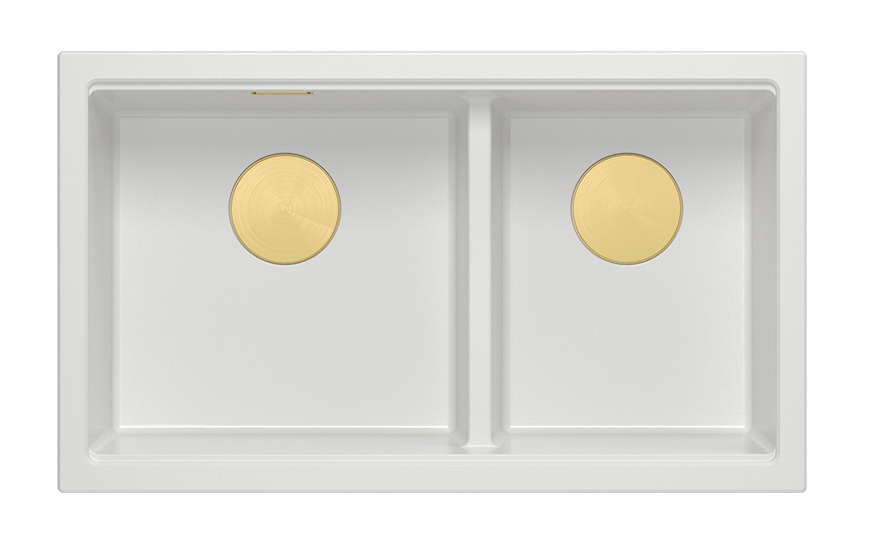 Zestaw zawiera zlewozmywak wpuszczany LOGAN 120 GraniteQ SNOW WHITE + nakładka na odpływ + syfon save space z odpływem 3,5" SteelQ PVD złoty