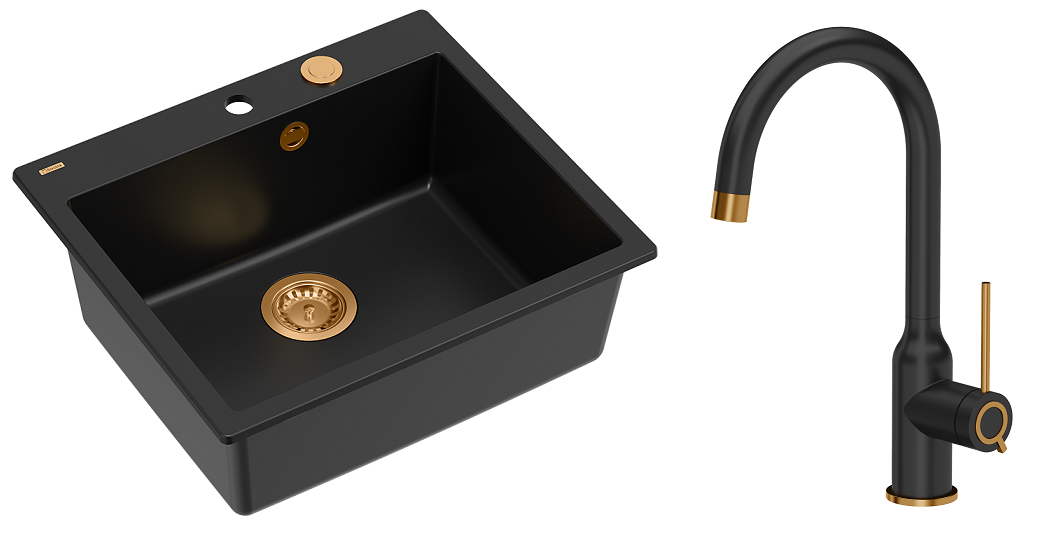 Zestaw zawiera zlewozmywak MORGAN 110 GraniteQ BLACK DIAMOND + bateria kuchenna INGRID Q LINE + syfon Push-2-Open save space z odpływem 3,5" SteelQ PVD Miedziany
