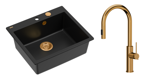 Zestaw zawiera zlewozmywak MORGAN 110 GraniteQ PURE CARBON + bateria kuchenna JENNIFER Q LINE SLIM z wyciąganą wylewką i funkcją prysznica + syfon Push-2-Open save space z odpływem 3,5" SteelQ PVD miedziany