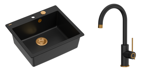 Zestaw zawiera zlewozmywak MORGAN 110 GraniteQ PURE CARBON + bateria kuchenna JODIE Q LINE SLIM + syfon Push-2-Open save space z odpływem 3,5" SteelQ PVD miedziany
