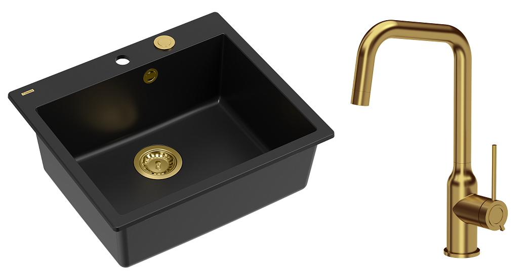 Zestaw zawiera zlewozmywak MORGAN 110 GraniteQ PURE CARBON + bateria kuchenna NATALIE Q LINE + syfon Push-2-Open save space z odpływem 3,5" SteelQ PVD złoty