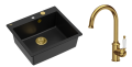 Zestaw zawiera zlewozmywak MORGAN 110 GraniteQ PURE CARBON + bateria kuchenna RACHEL + syfon Push-2-Open save space z odpływem 3,5" SteelQ PVD złoty