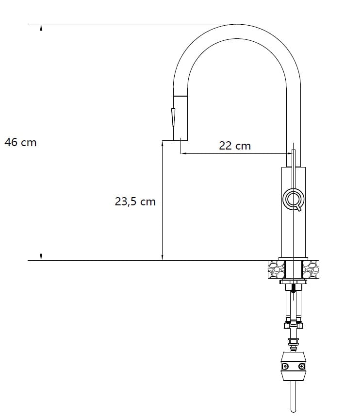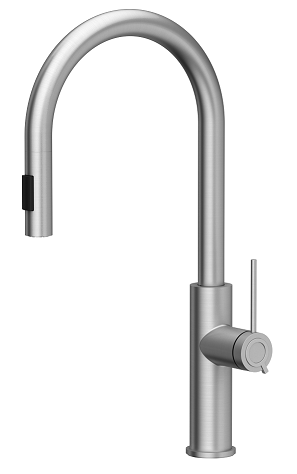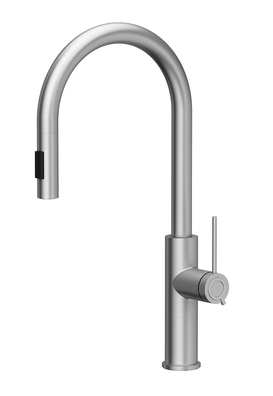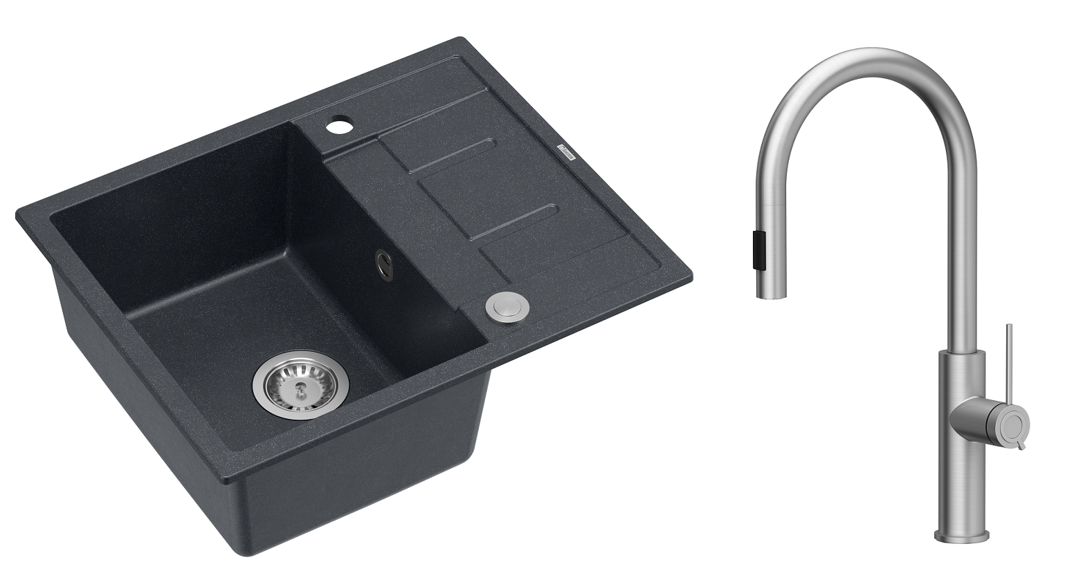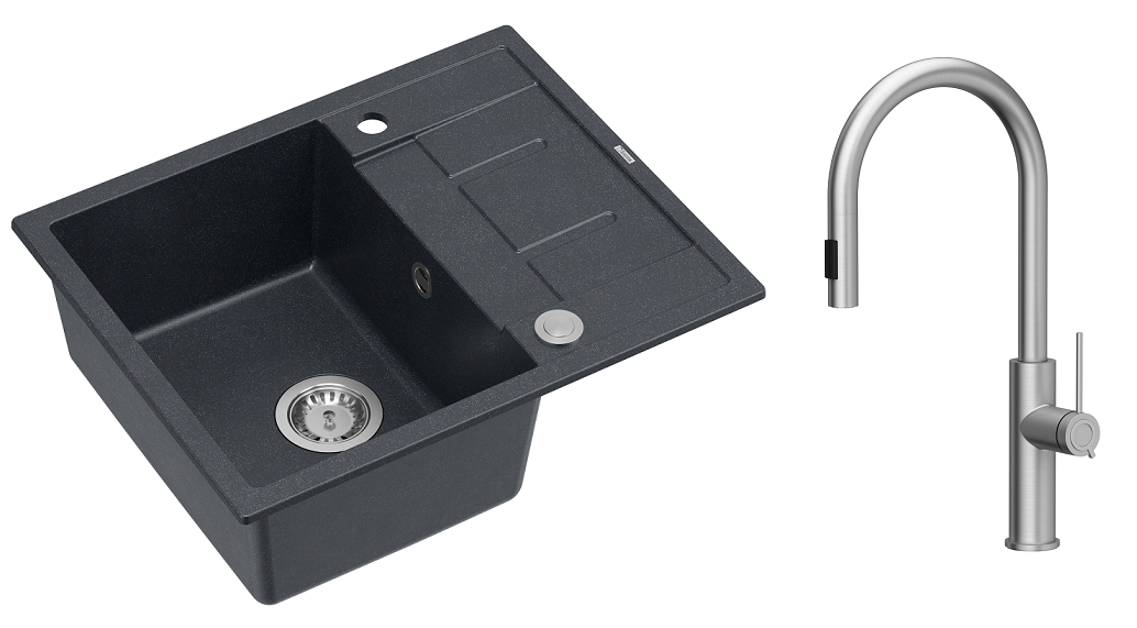 Zestaw zawiera zlewozmywak MORGAN 116 GraniteQ BLACK DIAMOND + bateria kuchenna JENNIFER Q LINE SLIM z wyciąganą wylewką i funkcją prysznica + syfon Push-2-Open save space z odpływem 3,5" SteelQ PVD stalowy