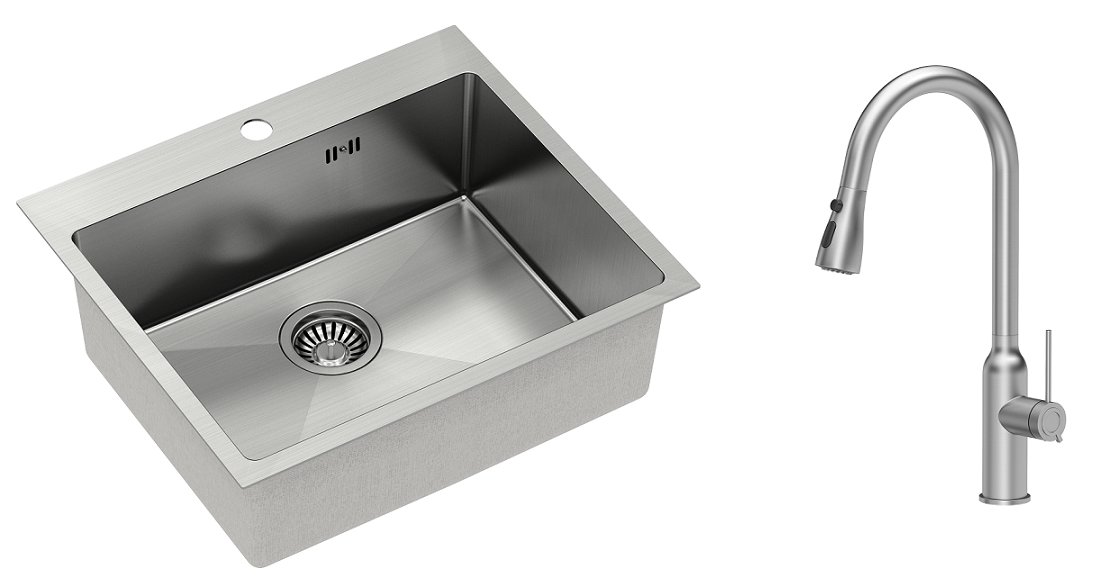 Zestaw zawiera zlewozmywak stalowy RUSSEL 110 STAL SZCZOTKOWANA + bateria kuchenna JESSICA Q LINE + syfon save space z odpływem 3,5"