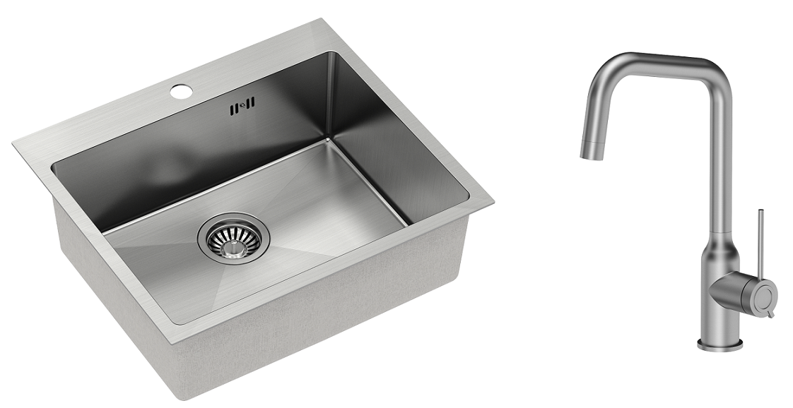 Zestaw zawiera zlewozmywak stalowy RUSSEL 110 STAL SZCZOTKOWANA + bateria kuchenna NATALIE Q LINE + syfon save space z odpływem 3,5"