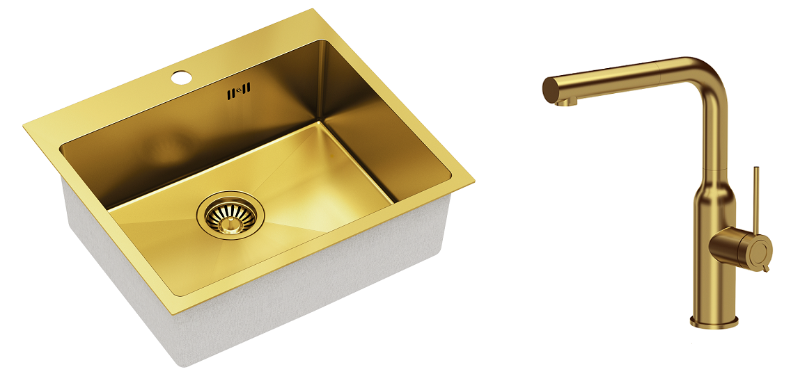 Zestaw zawiera zlewozmywak stalowy RUSSEL 110 ZŁOTY + bateria kuchenna ANGELINA Q LINE + syfon save space z odpływem 3,5"