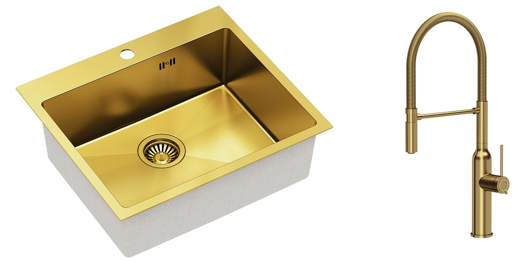 Zestaw zawiera zlewozmywak stalowy RUSSEL 110 ZŁOTY + bateria kuchenna MARILYN Q LINE z ruchomą wylewką + syfon save space z odpływem 3,5"