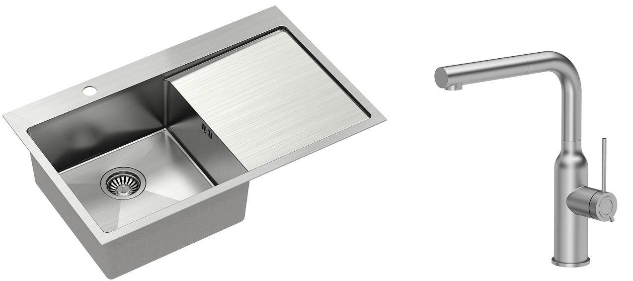 Zestaw zawiera zlewozmywak stalowy RUSSEL 111 STAL SZCZOTKOWANA + bateria kuchenna ANGELINA Q LINE z wyciąganą wylewką + syfon save space z odpływem 3,5"