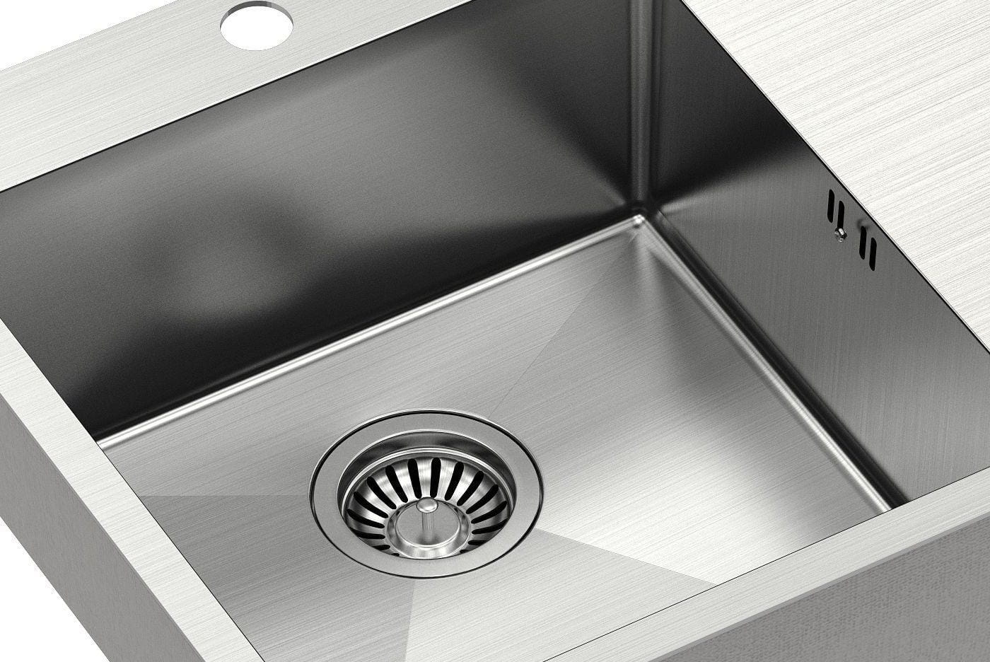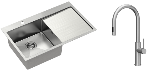 Zestaw zawiera zlewozmywak stalowy RUSSEL 111 STAL SZCZOTKOWANA + bateria kuchenna JENNIFER Q LINE SLIM + syfon save space z odpływem 3,5"