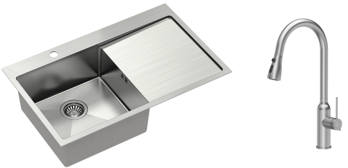 Zestaw zawiera zlewozmywak stalowy RUSSEL 111 STAL SZCZOTKOWANA + bateria kuchenna JESSICA Q LINE z wyciąganą wylewką i funkcją prysznica + syfon save space z odpływem 3,5"