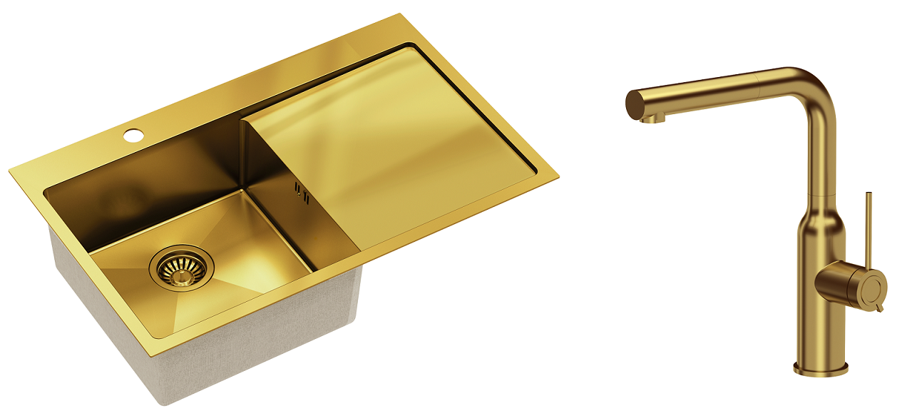 Zestaw zawiera zlewozmywak stalowy RUSSEL 111 ZŁOTY + bateria kuchenna ANGELINA Q LINE z wyciąganą wylewką + syfon save space z odpływem 3,5"